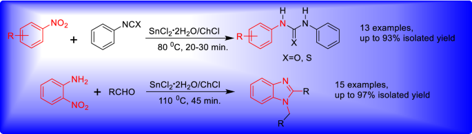 In this contribution, a fast and simple method for the synthesis of unsymmetrical urea derivatives and N-arylmethyl-2-substituted benzimidazoles was developed starting from nitroarenes. The reaction of nitroarenes and phenyl isocyanate or phenyl isothiocyanate in tin (II) chloride dihydrate/choline chloride eutectic mixture afforded the expected urea and thiourea derivatives, while the reaction of different aldehydes with o-nitroaniline or 4-methoxy-2-nitroaniline shows a markedly high preference for the obtention of N-arylmethyl-2-substituted benzimidazoles over the 2-substituted analogues. This method offers a straightforward alternative to obtain the target compounds in good to excellent yields with short reaction times employing an operationally simple experimental set-up.