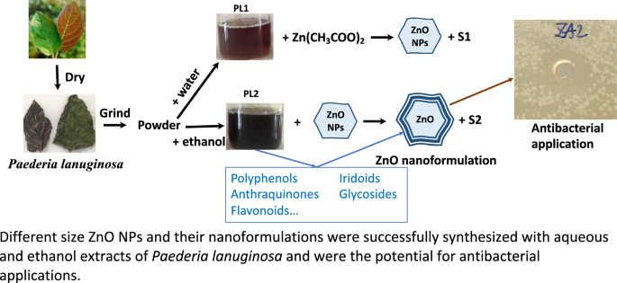 Various-sized ZnO nanoformulations synthesized with both aqueous and ethanol extracts of Paederia lanuginosa leaves