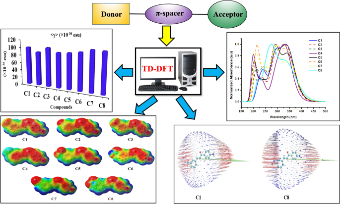 Materials having nonlinear optical (NLO) properties have shown hi-tech uses in a variety of modern fields including telecommunications, solid-state physics, laser optics and more recently in quantum computing. The current study offers a comprehensive computational analysis of the chalcone compounds designed through halogens and traditional acceptors. The molecular structure and electronic properties of parent compound (E)-1-(4-aminophenyl)-3-(3-chlorophenyl)prop-2-en-1-one (C1) were quantum chemically simulated and found in good agreement with experimentally reported results. The new chalcone compounds C2–C8 were also proposed by substituting chlorine with acceptors (F, Br, CH3, CF3, COOH, CN and NO2) into a benzene ring with fixed donor (aniline) and a π-bridge (acrolein). DFT and TD-DFT calculations were employed to shed light on charge transfer properties, promising structures, density of states plots and NLO characteristics. The substitution with acceptors effectively modified the structures with halogens and nonhalogen groups, resulting in improved NLO characteristics. A striking NLO response was seen in all proposed compounds. It is interesting to note that the NLO characteristics of C2–C3 and C4–C8 have been significantly improved by the intramolecular charge transfer (ICT) process with β// value of 18.30 × 10−30 esu. However, C7 showed the highest < γ > values of 106.6 × 10−36. Among C1–C8 compounds, C8 had a narrower HOMO–LUMO energy gap, facilitating efficient electronic excitations and resonance enhancement which led to an improved NLO response. TDM analysis confirms the intramolecular charge transfer (ICT) in C1–C8 compounds due to the successful migration of charge from donor to acceptor via π-bridge. The current study intrigues scientific interest regarding the formation of chalcone-based appealing NLO compounds that may be useful in recent high-tech applications.