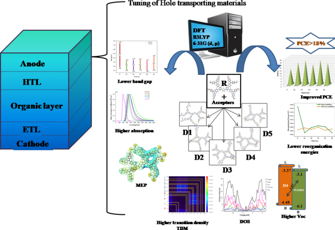 Fused heterocyclic core-based molecules have high-performing advantages; however, non-fused heterocyclic materials deserve to be studied because of their facile synthetic routes and tunability in optoelectronic properties. In this work, we reported five molecules, namely, D1, D2, D3, D4, and D5 containing imidazolyl–thienyl–imidazolyl-based core, and four peripheral TPA donor units substituted with five acceptors A1, A2, A3, A4, and A5 by thiophene spacer were simulated for theoretical investigation of photovoltaic properties using reference R molecule as a model. For the optimization of geometry and forecasting important electronic parameters, computations with density functional theory-based B3LYP functional and 6-31G (d, p) basis set in both gas and THF were carried out. The calculations include frontier molecular orbital (FMO) energies, band gap energies, density of state (DOS), transition density matrix (TDM), reorganizational energies of hole and electron, molecular electrostatic potential (MEP), open-circuit voltage (Voc), and power conversion efficiencies (PCE). The results show that this molecular engineering of non-fused rings endows these molecules with interesting features, including the shift in absorption, change in frontier orbital energies, and decrease in reorganizational energies and elevating device efficiencies PCE = 7.44% when compared with reference R = 1.35%. The molecular strategy of these new molecules give us the possibility that these simple structured, and easy to chemically modified non-fused rings can be used as building blocks in OSCs and PSCs.