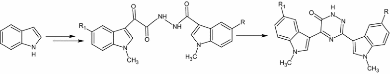 Abstract: A new series of bis indolyl tri keto diazo compounds and 3,5-bis(3′-indolyl) triazinones were designed and synthesized as anticancer agents. Their anticancer activity was screened in vitro towards four different human cancer cell lines like HeLa, MCF-7, MDA-MB-231 and A549 cell lines. Among them, compounds 17a and 17b showed potent cytotoxicity with inhibition (IC50) values of 4.6 and 1.3 µM on Human Cervical cancer cell line, respectively. The in silico simulation studies using ADT 1.5.6 tools revealed unique π–π interactions of indole ring of compound 17b with colchicines active site residue Tyr312 could be a valid reason behind its maximum potency when compared to remaining compounds in responsible of its higher activity.