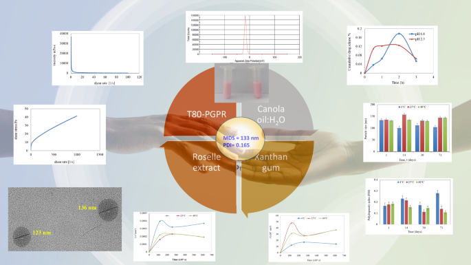 Hibiscus sabdariffa Linn. (Roselle) is a good source of the anti-diabetic agents like cyanidin-3-sambubioside, delphinidin-3-sambubioside, and delphinidin-3-glucoside. However, their rapid degradation nullifies their maximal dosage delivery to the human body to adequately impart their therapeutic benefits. Hence, this work aimed to improve the absorption of anti-diabetic components in the Hibiscus sabdariffa Linn (roselle) extract through oral consumption of a w/o nanoemulsion prepared using an integrated low-energy phase inversion and high-energy ultrahomogenization method. The water-in-oil nanoemulsions (w/o) were screened to identify the optimal condition for preparing stable nanoemulsions with the lowest mean droplet size (MDS) of < 150 nm. The best nanoemulsion composition yielded a MDS and polydispersity index of 133.6 nm and 0.165, respectively. The low conductivity (5 µScm−1) alongside the absence of phase separation under an accelerated stability study (centrifugal force and freeze–thaw cycles) and storage (4, 25, and 40 °C) for up to 71 days verified the w/o nanoemulsion’s identity and its shelf-life stability. The abovementioned data collectively verified the stability of the roselle extract w/o nanoemulsion. The first two-hour in vitro release study showed the liberation of 85% and 60% of the bioactive ingredients at pH 6.8 and pH 2.5, respectively. The latter’s nonlinear release kinetics indicated a longer residence time that supported a more gradual release of the active ingredients. This is the first report detailing the preparation of an orally consumed roselle extract w/o nanoemulsion as an anti-diabetic agent. The formulated w/o nanoemulsion was suitable for the gradual release of the anti-diabetic agents through the simulated gastrointestinal tract.