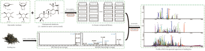 Kuding tea, which is a widely consumed tea in China and other southeastern Asian countries made from the leaves of Ilex kudingcha C.J. Tseng, possesses numerous beneficial effects on human health. Several studies have demonstrated that triterpenoid saponins are the main bioactive components of Kuding tea, which can be used in the treatment of various metabolic disorders. The present study deals with the development of a predict-filter strategy combined with the ultra-high-performance liquid chromatography coupled with tandem quadrupole/time-of-flight mass spectrometry for the rapid characterization of saponins in Kuding tea extract. Structural elucidation of all triterpenoid saponins was performed by using an in-house spectral library based on existing literature. A total of 80 compounds in Kuding tea were found to be saponins with high probability, of which 9 seems to be novel. Furthermore, the proportion of different saponins classified by the type of aglycones and monosaccharides on the glycosidic chain were evaluated. Overall results showed that the our predict-filter strategy can be used to filter saponins as well as other compounds possessing similar structures.