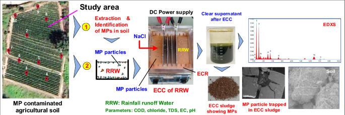The persistence of microplastics (MPs) in agricultural lands using plastic mulch will be an issue of major environmental concern in meeting the sustainable development goals (SGDs) of the near future. This research work aims at identifying and removal of MPs from rainfall runoff water (RRW) from MP-contaminated agricultural lands using the novel electrochemical coagulation (ECC) treatment technology. The MPs were extracted from the soil samples before identification. The pH, moisture content, MP abundance in soil, and particle size were determined. The RRW from the agricultural land loaded with MPs was treated using stainless steel (SS) electrodes in an electrochemical reactor. The removal efficiency of MPs, COD, chloride, and TDS at 45 min electrolyzing time was 98%, 46%, and 48%, respectively. Higher percentages of MP removal were achieved for increased MP concentrations in RRW. The difference in dry sludge generated during ECC for raw RRW and MP-loaded RRW was 2.42–4.09 kg/m3 of RRW treated. SEM, EDS, and ATR-FTIR spectroscopy analysis revealed the disintegration pattern of MPs into nano-sized particles. EDS of agricultural soil showed 8.2% carbon and 48.1% oxygen, whereas MP particles showed 62–64% carbon and 20–22% oxygen, respectively. The ATR-FTIR spectra for both spiked and extracted MP particle from the contaminated soil showed C–H stretch, CH2 bends, etc.; the MP particle was identified as LDPE-type plastic mulch. The EDS of ECC sludge showed loads of MPs with 47% C, 35% O, 1.6–2.3% Al, 2–2.6% Si and 10.3–12.9% Fe. The ECC process showed its effectiveness in 98% MP removal from the RRW in a short hydraulic retention time (HRT) of < 45 min.
