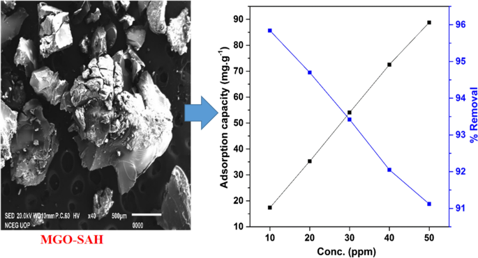 A smart and novel magnetite graphene oxide-doped superabsorbent hydrogel (MGO-SAH) consisting of magnetite graphene oxide (MGO), acrylamide (AAm), acrylic acid (AAc), and 2-acrylamido-2-propane sulphonic acid (AMPS) were synthesized through free radical addition polymerization at temperature > 55 °C in oven for one hour. The hydrogel successfully employed for crystal violet (CV) removal from model wastewater. Various characterization techniques such as FT-IR and SEM were used for as synthesized hydrogel. The FT-IR data show the establishment of interaction and distribution of MGO within the 3D network of hydrogels and interaction with CV during removal process. The removal capability of the MGO-SAH superabsorbent hydrogel toward the crystal violet was elucidated while using the batch adsorption mechanism. The removal performance of MGO-SAH hydrogel was investigated by applying various parameters, such as contact time, dye initial concentration, sample dosage and thermos-dynamical approach. The % removal of the CV was monitored from the model solution via UV/Vis 1100 spectrophotometer. The kinetic study was performed by using the pseudo first and pseudo second order kinetic models. It was found that the kinetics of the materials follow pseudo second order kinetic model. The study showed that the % removal increases with increasing the sample dosage which is due to the increase in the number of active sites and diffusion capability of hydrogels. However, the % removal decrease for increasing in the concentration of dyes for constant weight sample (0.1 g) of the as synthesized materials due to insufficient viability of active sites for adsorption process. The adsorption efficiency of MGO-SAH was 88.78 mg g−1 with percent removal value of 97%. In addition, some thermos-dynamical variables such as ∆G°, ∆H°, and ∆S° were calculated and the negative value found for ∆G° confirms the spontaneity of the process. A negligible decrease in efficiency was recorded in the recycling performance of the given hydrogel system.