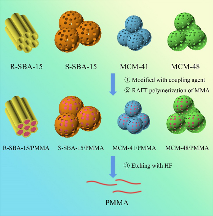 Abstract: A series of mesoporous silica (MS) materials, including rod-like and spherical SBA-15, spherical MCM-41, and MCM-48, was successfully synthesized and modified by silane coupling agent γ-aminopropyltriethoxysilane. The modified MS was utilized as a microreactor for solution reversible addition–fragmentation transfer (RAFT) polymerization of methyl methacrylate (MMA) using xanthate as a chain transfer agent and azodiisobutyronitrile as an initiator. Notably, modified MS had a low specific surface area and pore volume while maintaining the original morphological structure. Given to the confinement effects, poly(methyl methacrylate) (PMMA) prepared from internal mesoporous channels had higher molecular weight and initial thermal decomposition temperature than those from conventional RAFT polymerization. Moreover, PMMA obtained from spherical SBA-15 and modified MCM-48 exhibited the highest molecular weight (Mn = 8.78 × 104 and Mn = 7.43 × 104, respectively). This work provided a novel approach in designing a polymer microstructure for a more comprehensive application, such as in drug release. Graphical abstract