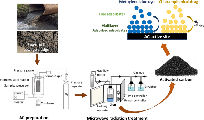 Abstract: Refractory pollutants like pharmaceuticals and dyes have become excessively prevalent in most Malaysian water bodies because of the growing textile and pharmaceutical industries. Hence, this work employed activated carbon prepared from freely available paper mill sewage sludge for removing chloramphenicol (CAP) and methylene blue (MB). Modest treatment of low-temperature carbonisation assisted with a short activation time of microwave radiation had been used. Analysis of variance of central composite design resulted in the optimum conditions of 440-W radiation power and 3-min activation time for optimum removal of 70% CAP and 51% MB. The surface area of the paper mill sewage sludge activated carbon (PMSSAC) improved greatly from 1.14 to 412 m2/g, with the highest adsorption capacity of 13 mg/g. The scanning electron microscope images demonstrated the efficiency of microwave radiation treatment, where more cavities and pores were observed on activated carbon for improved adsorbate penetration. The Freundlich isotherm and the pseudo-second-order model appeared to best fit the kinetic data. Furthermore, the high affinity of adsorbate towards the PMSSAC surface could be the plausible mechanism, as indicated by the high amount of adsorption within the initial stage of adsorption. Thus, it is envisaged that our PMSSAC could be effectively employed in actual wastewater systems, as evidenced by excellent CAP and MB removal. Graphical abstract