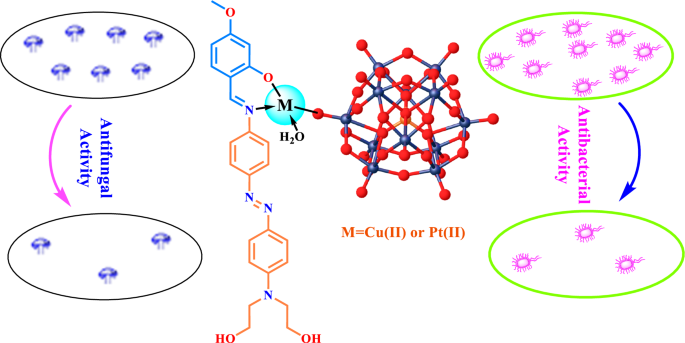 Abstract: The hybrid compounds (KL1–KL3) based on Keggin polyoxometalate (POM) were synthesized from the reaction between azo-imine ligands (HL1–HL3) and Keggin-type POM. Characterizations of the obtained compounds were done by elemental analyses, FTIR, MALDI-TOF, ICP-MS, UV–vis and photoluminescence spectra. To characterize the azo-imine ligands (HL1–HL3), 1H(13C)NMR methods were also used. To obtain the Cu2+ and Pt2+ complexes (POM-complexes) of the hybrid compounds (KL1–KL3), the hybrid compounds and metal salts reacted in the C2H5OH solution. The POM-complexes were characterized by the spectroscopic and analytic methods, and then their photophysical, electrochemical and antimicrobial properties were investigated. In the UV–vis spectra of the POM based hybrid compounds KL1–KL3, while ligand-centered π–π* transitions are in the range of 333–316 nm, the charge transfer transitions (CT) observed in the range of 458–453 nm. While the emission values of KL1–KL3 compounds in DMF solution are in the range of 543–552 nm, the value of hybrid complexes shifted to the range of 570–697 nm. Antimicrobial activities of hybrid metal complexes were investigated and it was determined that all complexes showed activity against penicillium spp. Thermogravimetric analysis (TGA) studies were carried out to investigate the thermal behaviours of the metal complexes of the hybrid compounds. Graphical abstract
