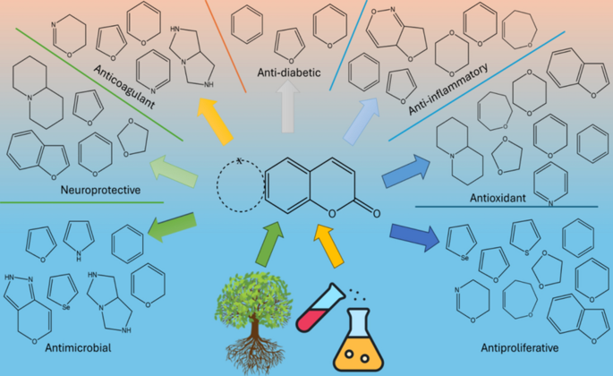 Abstract: Coumarin derivatives are naturally and synthetically derived compounds and are considered one of the most versatile classes of heterocycles. Discovering, synthesizing, and examining coumarin derivatives for several biological activities are a constant endeavor due to their pharmacological activities, high selectivity, simple design to achieve optimal efficiency, and few side effects. Coumarin gained notable attention and became such a privileged scaffold and promising building block for the development of different medical agents for the treatment of various diseases. The scientists are continuously trying to synthesize many bioactive coumarins by either improving existing ones or exploring novel-based natural products. The gathering of two or more heterocyclic nuclei in one molecule can potentiate the pharmacological effects of the resulting system or even create new pharmacological properties. When different heterocycles are attached to coumarin either as a substituent or as a fused component into a lactone or benzene ring, a synergistic or additive effect has been observed in many studies. The present article delves deeply into the pharmacological potential, structure–function correlations, natural sources, and synthetic techniques of heterocycles fused on a 6,7-coumarin framework. The authors searched several stores of data, including Scopus, Google Scholar, PubMed, Web of Science, and PubMed. Following a deep evaluation, authors were able to locate and include 189 relevant papers that were released from 2000 to mid-2023. Medicinal chemists may be enabled to use this reviewed information to develop and synthesize biologically active leads based on heterocycles fused on 6,7-coumarin scaffolds. The knowledge built from this information may have significant medicinal advantages in the not-so-distant future to develop potent medication, serving better in therapeutics. Graphical Abstract