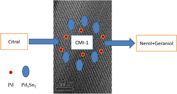 Abstract: The selective hydrogenation of citral to unsaturated alcohols was studied on x%Sn–Pd/CMI-1 catalysts (x in the range 0–3 wt%) synthesized by co-impregnation on an organized mesoporous silica of high specific surface area. The characteristics of the prepared catalysts were evaluated by chemical analysis, X-ray diffraction, nitrogen physisorption, transmission electron microscopy and temperature-programmed reduction, and from the activity for the model reaction of cyclohexane dehydrogenation. The existence of an interaction between Pd and Sn on the bimetallic catalysts was deduced, with the formation of a hexagonal Pd3Sn2 alloy. The catalytic performances were evaluated for the citral hydrogenation performed at 130 °C, under 76 bar hydrogen pressure, in liquid phase (isopropanol as solvent). The addition of Sn to Pd led to a decrease in the citral conversion accompanied by an increase in the selectivity to unsaturated alcohols, this phenomenon being explained by the decrease in the number of active Pd species on the surface of the catalysts and the presence of Pd3Sn2 alloy which activates the C=O bond of citral. A maximum value of 72% for the unsaturated alcohols selectivity was reached with the bimetallic 2%SnPd/CMI-1 catalyst with a citral conversion around 75% at the end of reaction time. Graphical abstract