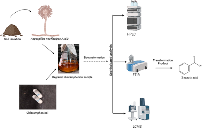 Abstract: The possibility of environmental contamination associated with chloramphenicol requires special attention. The primary challenges in the biodegradation of chloramphenicol from the contaminated environment are obtaining effective antibiotic-degrading microbes of pure cultures and determining the entire metabolic pathway involved in efficient degradation. The potent strain Aspergillus neoflavipes AJC3 was able to degrade 98.70% of chloramphenicol at a concentration of 50 mg/L within 8 d. The biodegradation pattern of chloramphenicol was evaluated by employing high-performance liquid chromatography (HPLC) and validated through gas chromatography mass spectroscopy (GC–MS), liquid chromatography mass spectrometry (LC–MS) and Fourier transform infrared spectroscopy (FTIR). Three metabolic compounds were identified during the chloramphenicol biodegradation process and the degradation pathway involved zero-order and first-order kinetics model according to the kinetics energy. And to evaluate the effects of chloramphenicol in aquatic environment, toxicity studies were conducted using the nauplii and cysts of Artemia salina and the nauplii mortality was evaluated at 24 h. Graphical abstract