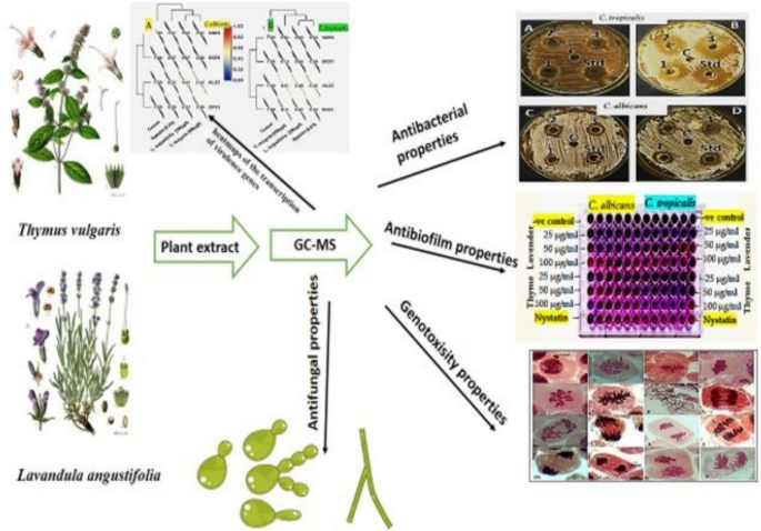 Keywords: Lavandula angustifolia and Thymus vulgaris; Candida albicans ATCC 2091 and Candida tropicalis ATCC 1369; Gene expression; Virulence genes; RT‒PCR; Cell damage; Genotoxicity