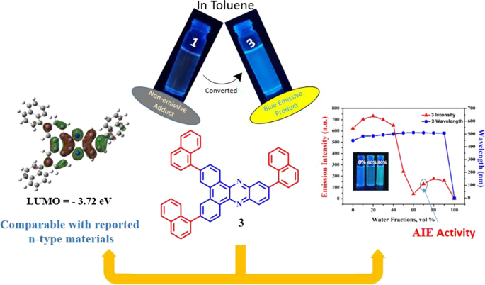 In this work, five 3,6,11-trisubstituted-dibenzo[a,c]phenazine (2–6) derivatives were synthesized by employing Palladium-catalyzed Suzuki–Miyaura ‘C–C bond’ coupling reaction and characterized. Absorption spectra of 2–6 show the formation of charge-transfer complexes. Dyes exhibit blue-green fluorescence with emission maxima 434–506 nm in various solvents and neat solid film. To elucidate AIE phenomenon, photophysical properties of dye 2 and 3 in different THF/water mixture were studied. The HOMO and LUMO energy level were found in the range of − 6.38 to − 6.82 eV and − 3.67 to − 3.75 eV with an electrochemical bandgap of 2.71–3.08 eV. The HOMO and LUMO distribution in molecules were further studied by DFT/TD–DFT calculations. Herein, characteristic blue emission, comparable energy levels with n-type materials, and good thermal stability of derivatives make them a potential candidate for their application in optoelectronics.