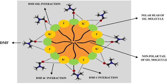 The viscosity of different concentrations of sunflower oil + DMF and corn oil + DMF solvents in the presence of potassium iodide was measured at temperatures of 303.15–323.15 K in steps of 5.0 K. The viscosity increased with the increase in the concentration of potassium iodide and oil, while an increase in temperature decreased the viscosity. The change in the viscosity was used to evaluate the structural changes and electrostatic interactions produced by the addition of potassium iodide to the oil + DMF solvent. The structure-breaking or structure-promoting behavior of potassium iodide was evaluated by applying the Jones–Dole, Vand, and Breslau–Miller equations. The increase in viscosity B-coefficients with the temperature confirmed the structure-breaking behavior of potassium iodide in the oil + DMF solvent. The ionic B-coefficients were evaluated by subjecting the experimental data to the mathematical approximations available in the literature. The Moulik and Einstein relations were also found applicable to the viscosity of the oil + DMF solvent while deviations were observed from the Thomas relation. The thermodynamic parameters of the viscous flow also supported the obtained results about the ionic interactions.
