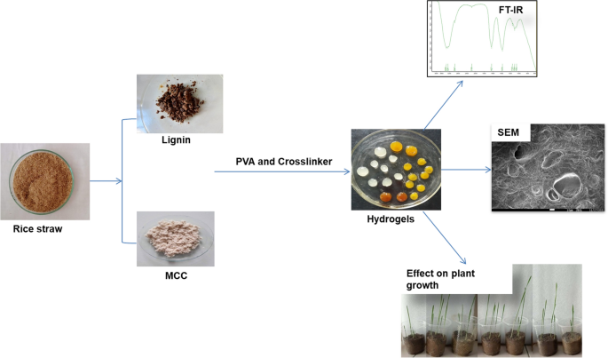 Burning of rice straw has been causing a number of environmental issues in Northern India which enforces researchers to find out different ways for valorization of this unavoidable biomass. Rice straw biopolymers, i.e. cellulose, hemicellulose and lignin can be used for production of various sustainable organic products. In the present study, microcrystalline cellulose (MCC) and lignin were extracted from rice straw by dilute acid pre-treatment method followed by alkaline hydrolysis. MCC and lignin were used as raw material for synthesis of hydrogels using polyvinyl alcohol as matrix template, glutaraldehyde/epichlorohydrin as cross-linkers. The characterization of synthesized hydrogels with FT-IR and SEM analysis revealed that hydrogels using glutaraldehyde have less porosity and tight bonding network whereas epichlorohydrin caused loose bonding between polymers and resulted in formation of large pores in hydrogels. Swelling ratio and reswelling capacity of hydrogels showed that lignin hydrogels performed best than all other hydrogels. The effects of hydrogels on total fresh and dry biomass, leaf area, seedling length of germinated seedlings of wheat and moong bean were observed under control and water stress conditions. All hydrogels performed well under stress conditions as compared to control. However, both lignin hydrogels performed best and gave significant highest growth under stress conditions. These biopolymer based hydrogels can be recommended for use as growth media ingredient in water deficient soils.