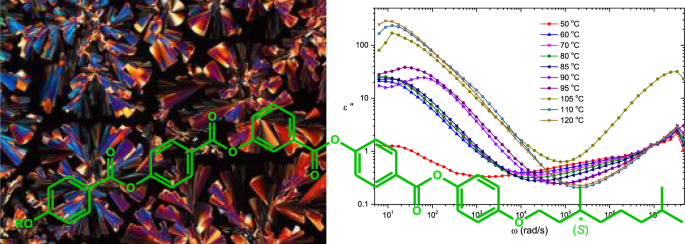 The synthesis, mesomorphic and dielectric investigation of new unsymmetrical bent-core mesogens derived from 3-hydroxybenzoic acid central core with linked two rodlike units carrying (S)-3,7-dimethyloctyloxy group and an n-alkyloxy chain at both terminals are presented. The liquid crystalline properties of the new unsymmetrical bent-core materials have been investigated by polarizing optical microscopy and differential scanning calorimetry. New compounds with the reversed ester linking unit exhibit a monotropic or enantiotropic columnar mesophase at lower temperatures as compared to analogs with a straight chain depending on the presence of the branched (S)-3,7-dimethyloctyloxy terminal chain. Dielectric measurements for one of the bent-core mesogens, 3-[[4-[[4-(octyloxy)benzoyl]oxy]benzoyl]oxy]benzoic acid 4-[[4-((S)-3,7-dimethyloctyloxy)phenoxy]carbonyl]phenyl ester (OBDPE), have been carried out on the angular frequency range from 25.12 to 50265k rad/s at different temperatures. Thanks to dielectric measurements, real and imaginary dielectric constant, conductivity mechanism and dielectric relaxation mechanism of OBDPE were obtained.