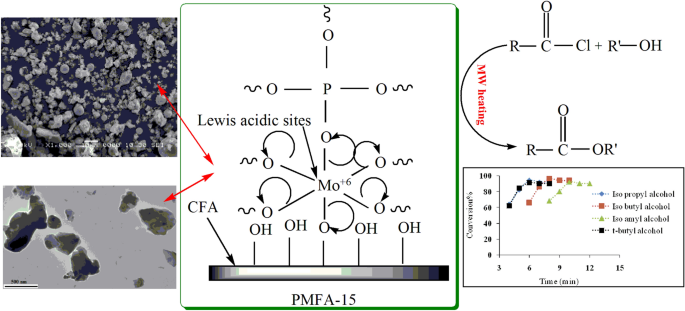 Cost-effective, efficient and green solid acid catalysts have been synthesized by incipient wetness impregnation of various weight fractions of phosphomolybdic acid (5, 10, 15 and 25 wt. %) on mechanically and thermally activated coal fly ash. N2 adsorption–desorption, XRD, FT-IR, SEM, SEM–EDX, TEM, TGA, UV–Vis DRS, solid state 31P MAS NMR were used for characterization of as synthesized catalysts. Catalytic active sites were developed on inert surface of coal fly ash by using various activation techniques whose performance was assessed over a series of acylation of various aliphatic alcohols. For rapid and higher catalytic activity, reactions were conducted in microwave heating mode. Impregnation of phosphomolybdic acid generates Lewis acidic sites on coal fly ash surface as inferred by pyridine adsorbed FT-IR studies which were then utilized in acylation reactions. Various reaction parameters like weight fraction of catalysts, molar ratio of reactants, time, temperature, etc. were optimized for attaining highest conversion %. The catalyst with 15 wt. % of phosphomolybdic acid was found to be more efficient and could be recycled up to five reaction cycles with analogous conversion %. Negligible leaching of catalyst was confirmed by hot filtration test. This work suggests an alternative approach for valorisation of industrial solid waste, coal fly ash in development of innovative, economical solid catalysts.