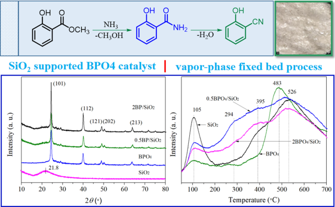 SiO2-supported BPO4 catalysts have been prepared via a convenient one-pot process, characterized by XRD, N2 adsorption/desorption, FTIR, and NH3-TPD and investigated in the production of salicylonitrile using methyl salicylate and ammonia as the raw material in a vapor-phase fixed bed process. The results indicated that supporting BPO4 in SiO2 could increase the surface area and the amount of the moderate-to-strong acidic sites on surface, which markedly improved the catalytic performance. The effects of various reaction conditions, the effects of compositions on the catalytic activity, and the stability of the process have been studied in detail. Under the optimized conditions, an excellent 91.6% yield of salicylonitrile could be obtained, and good stability for the process was observed. The present study would provide foundation for industrial production of salicylonitrile.