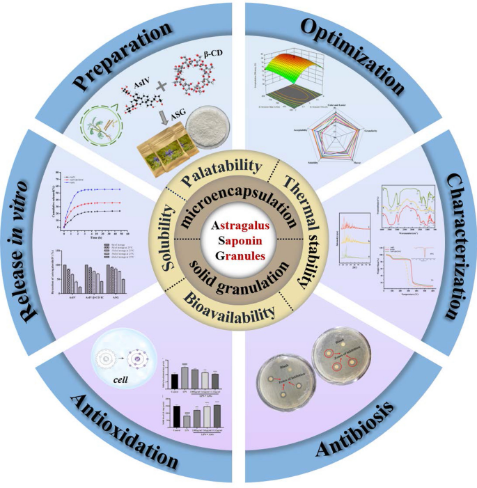 Abstract: Astragaloside IV/β-cyclodextrin inclusion complex (AsIV/β-CD IC) was successfully prepared by low-temperature sedimentation technology. Under the preparation conditions inclusion temperature 60 °C, inclusion time 3 h, core–wall material molar ratio 1:1, and inclusion rate 750 rpm, the optimal encapsulation efficiency reached 81.63%. It was characterized by scanning electron microscopy (SEM), Fourier-transform infrared spectroscopy (FTIR), X-ray diffractometer (XRD) and thermogravimetric (TGA). Physicochemical characterization of the AsIV/β-CD IC indicated that the complexation of AsIV/β-CD was successful, and the thermal stability of AsIV was improved clearly. Through granulation technology, astragalus saponin granules (ASG) with uniform size from AsIV/β-CD IC were obtained. ASG possessed significant water solubility and storage stability beside fine taste. In addition, ASG demonstrated beneficial bioactivity in antioxidant and antibacterial functions. Antioxidative stress detection showed that ASG could inhibit the increase of malondialdehyde (MDA) content and the decrease of superoxide dismutase (SOD) content in cells caused by lipopolysaccharides (LPS). In addition, in vitro antibacterial experiments of ASG showed that ASG has obvious antibacterial activity against 6 strains, especially the minimum inhibitory concentration (MIC) value of Escherichia coli and Bacillus subtilis reached 12.5 mg/mL. Graphical abstract